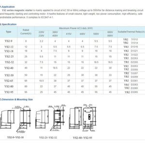 YS2 series magnetic starter is mainly applied to circuit of AC 50 or 60Hz,voltage up to 550V for far distance making and breaking circuit and frequently starting and controlling motor.It has the features of small volume,light weight,low power consuption,high efficiency,safe and reliable performance.It complies to IEC947-4-1.